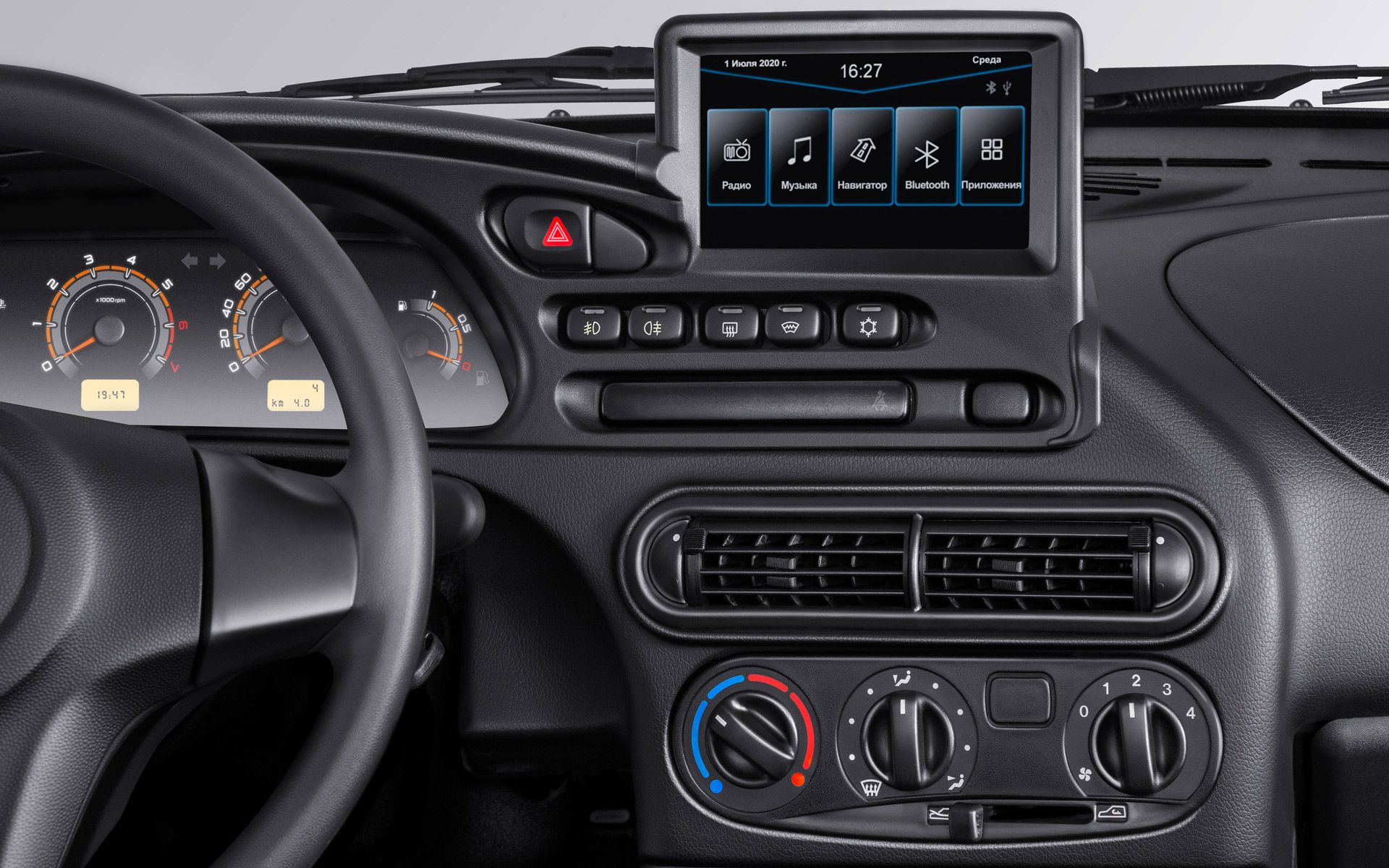 - Мультимедийная система (7'' цветной дисплей с TouchScreen, FM/AM, USB, AUX, Bluetooth, Hands free, E-Link – отображение экрана и управление Android-смартфоном*), 2 динамика, антенна наружная